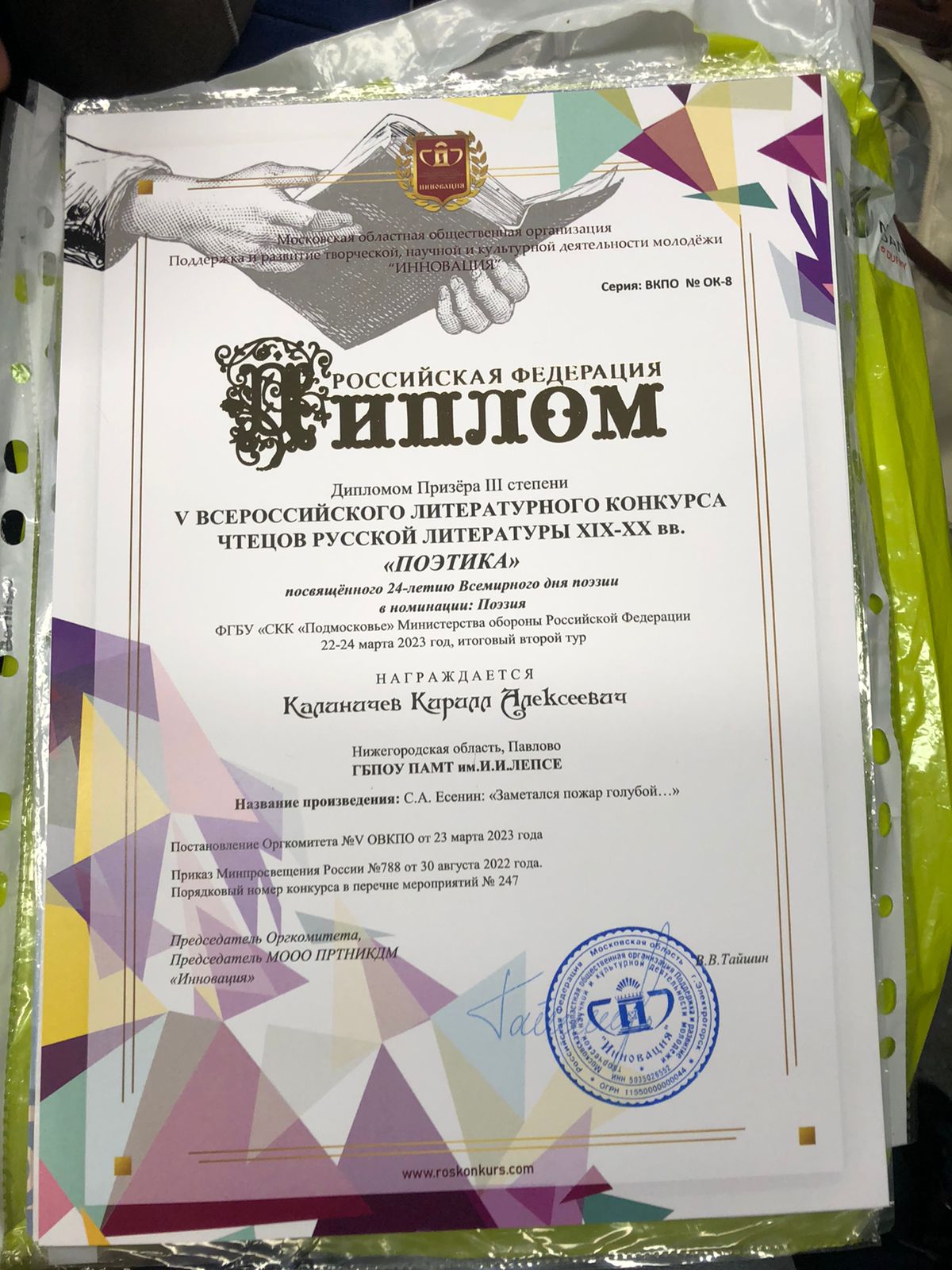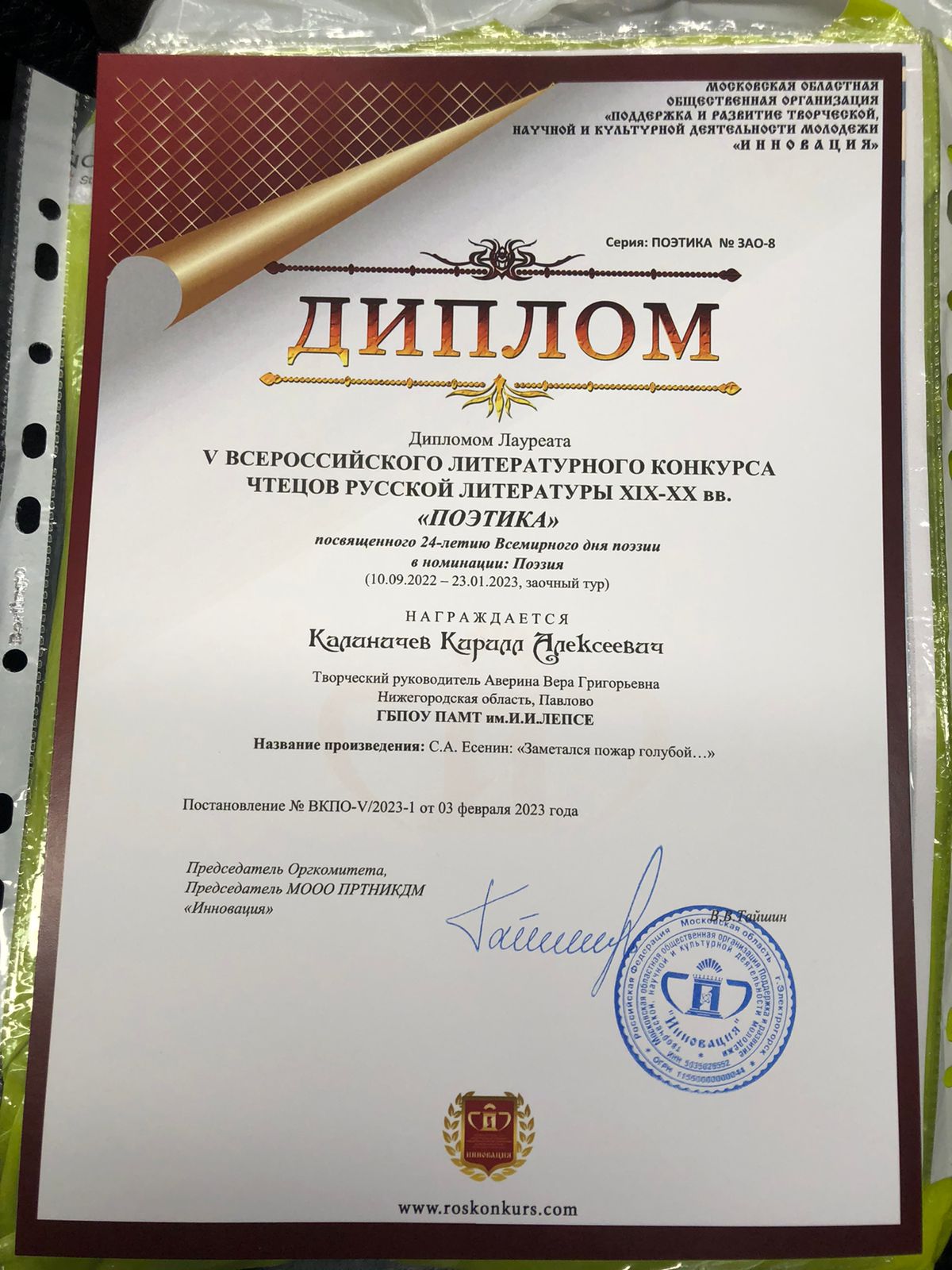 Участникам были предложены произведения разных авторов: А.Фета, А.Блока, С.Есенина, Ф.Тютчева и других. Конкурс проходил в два этапа: первый этап- отборочный (в дистанционной форме) и второй этап – заключительный (в очной форме). Принял участие в этом конкурсе и наш студент Павловского автомеханического техникума им.И.И.Лепсе, Калиничев Кирилл (гр.№ 2, 2 корпус). Им выбрано стихотворение С.Есенина «Заметался пожар голубой». Мы оказались в списке приглашённых участников на заключительный этап.