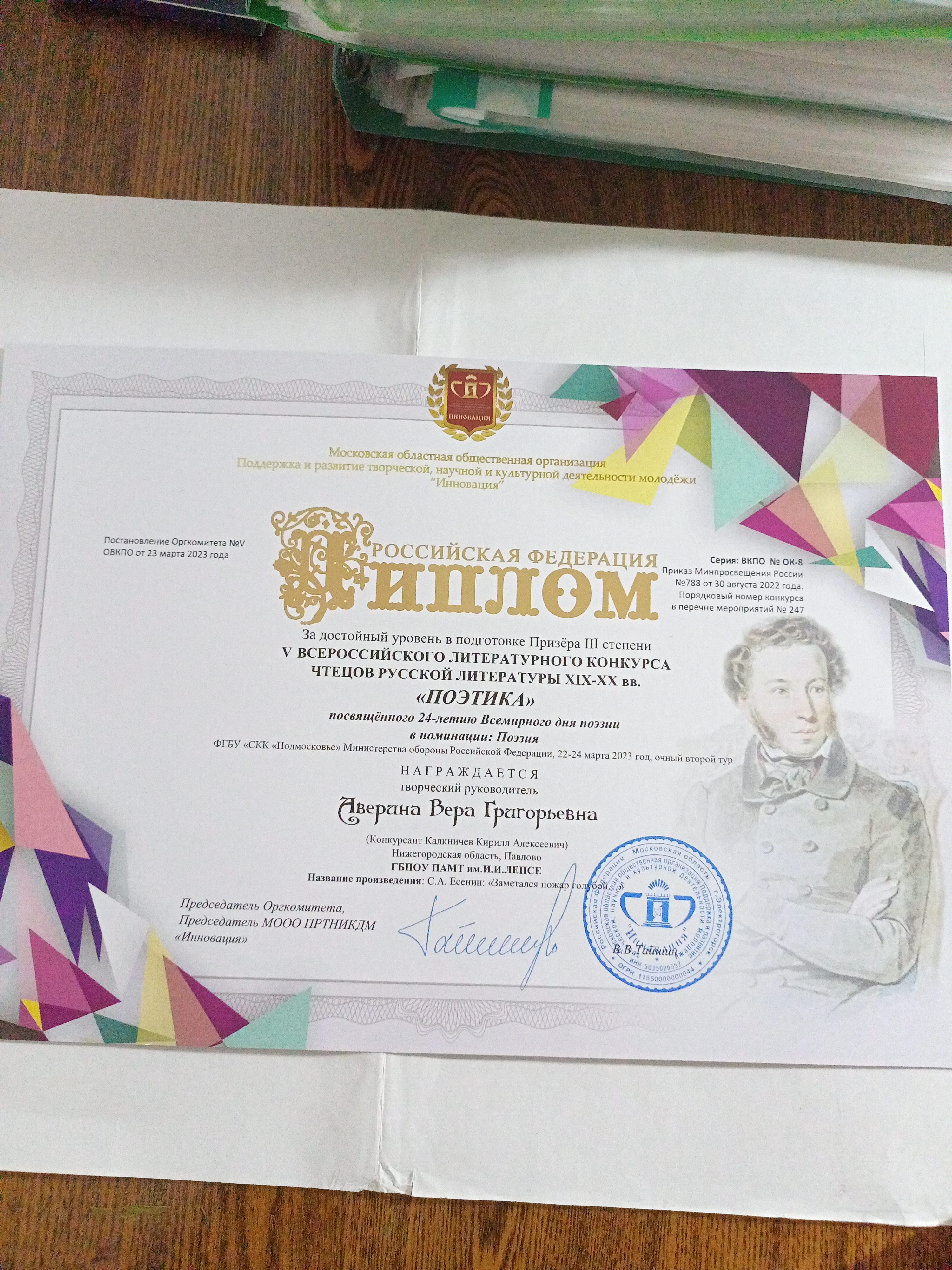 На реализацию данного указа был направлен Всероссийский литературный конкурс чтецов произведений поэтов русской литературы XIX-XX «Поэтика» для возрождения устных традиций поэтических чтений в каждом регионе нашей Родины с участием детей и молодёжи, чтобы повысить их интерес к чтению, письму и преподаванию поэзии. Организаторами этого конкурса является Московская областная общественная организация «Поддержка и развитие творческой, научной и культурной деятельности молодёжи «Инновация».
